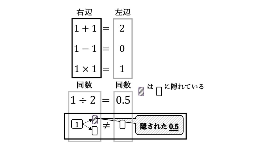 さて、割り算(÷)を考えるとき、(or)(&)の扱いを決めないとならない。集合論やブール代数で、(or)が足し算に対応し、(&)が掛け算に対応しているのに、計算機科学での(or) (&)、論理学での(or) (&)それぞれに意味が異なる。これは、後に説明するが(&)やそして(or)という単語の意味を「連語(conjunction)」「選語(disjunction)」を割り当てていることで問題を引き起こしているからだ。[論理学(大西)] また、(or)(&)は英語における接続助詞であり、「AとB」「AかB」の「と」や「か」は並列助詞であるという違いもある。これらの相違は隠された0.5をどう扱うかにおいて、足し算(+)演算子の中に、(or)(&)の性質(機能)が「混ざる」と「切り分ける」を含め潜んでいるからだろう。この状態を可視化させ機械に数学として意識させるのが「切算」processになる。よって、切算の出す解を「識」と日本語で記述する。割り算の機能を分解すると、1段階として等分に切り分けて、2段階として切り分けた断片を秘匿併存させた状態(&)で、3段階で切り分けたうちの一つを選別し(or)、4段階として、選択されなかった残りの断片を我々が定義する「直交した空間座標(これを反界と呼ぶ)」に右辺と左辺の質量保存「イコーリティの担保」のため移動させる演算機能とできるので、隠された(0.5)を「見ない」という意識(認知のゆがみ)ではなく、例えばこの「見ない」という条件を物理空間での観察と不確定性の関係から「折り込み隠す」とした追加加算される運動計算として、あえて意識における負の掛け算(×)として