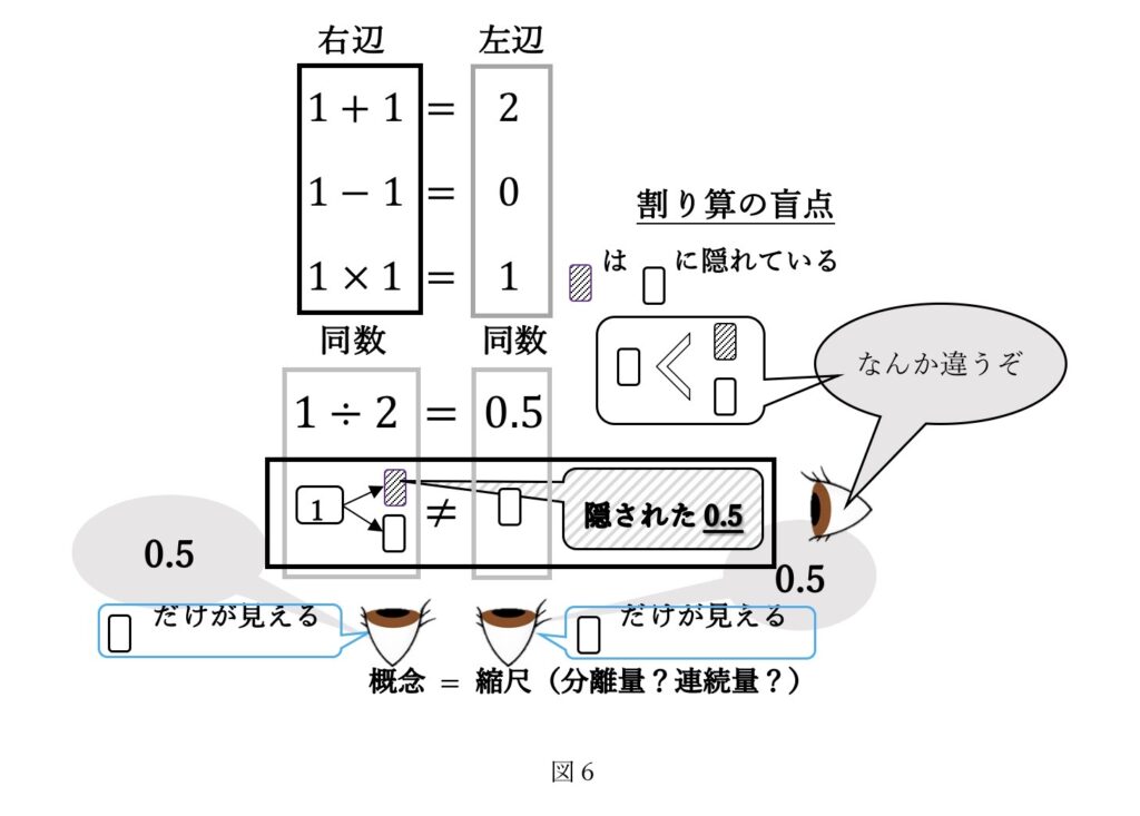 図6では、下からの視座では見えてない、灰色/斜線の四角紫が見えてくるが、これを我々は数学の幾何的視座の獲得と呼ぶ。この視座を獲得するなら、割り算(÷)が、スケールの計算なのか?分割の回数なのか?その結果による断片の量の計算なのか?もともとが、(-)ひくという記号を(÷)とした数学の歴史から絶対矛盾を内包させ「包含徐」「等分徐」と区別していることに気が付く。なので、純粋に道具として不便である。