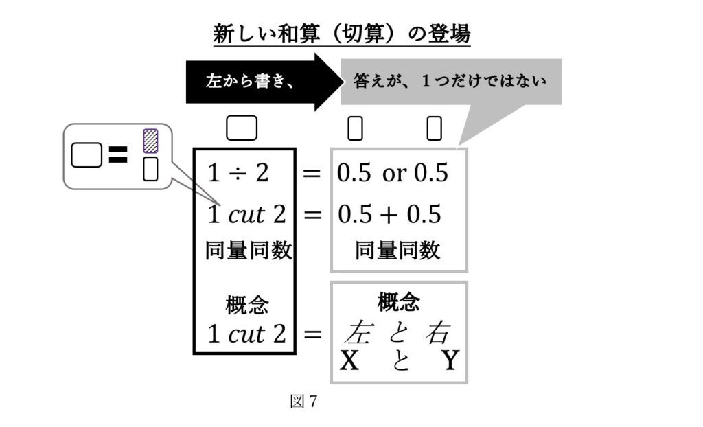 すると、図6のような割り算(÷)の盲点、観察視座の違いによる違和感を図7のような機能を獲得する分割算術を切算( )とした算術を発明することで単純化できた。切算( )では、cutや の記号を使い、量、概念双方を矛盾なく扱える利便性を確保した。これで、概念を数式に導入で来たので、哲学テーマを記述する基本ツールとし、概念を意識で操作する答えを出力するので、「識」を出すと日本語では表現する。