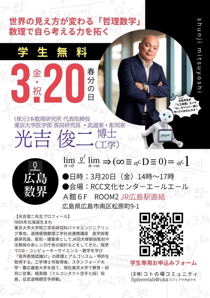日時:2026年3月20日(金)14:00~17:00会場:RCC文化センターエールエール(広島県) A館6階 ROOM2 広島県広島市南区松原町9-1料金:学生無料主催:コトの場コミュニティ Spherelab@uka スフィアラボ@ウカ ■会場マップ〒732-0822 広島県広島市南区松原町9−1 Post Share LINE note この記事のタイトルとURLをコピーする 魂の数式講座を行います 前の記事